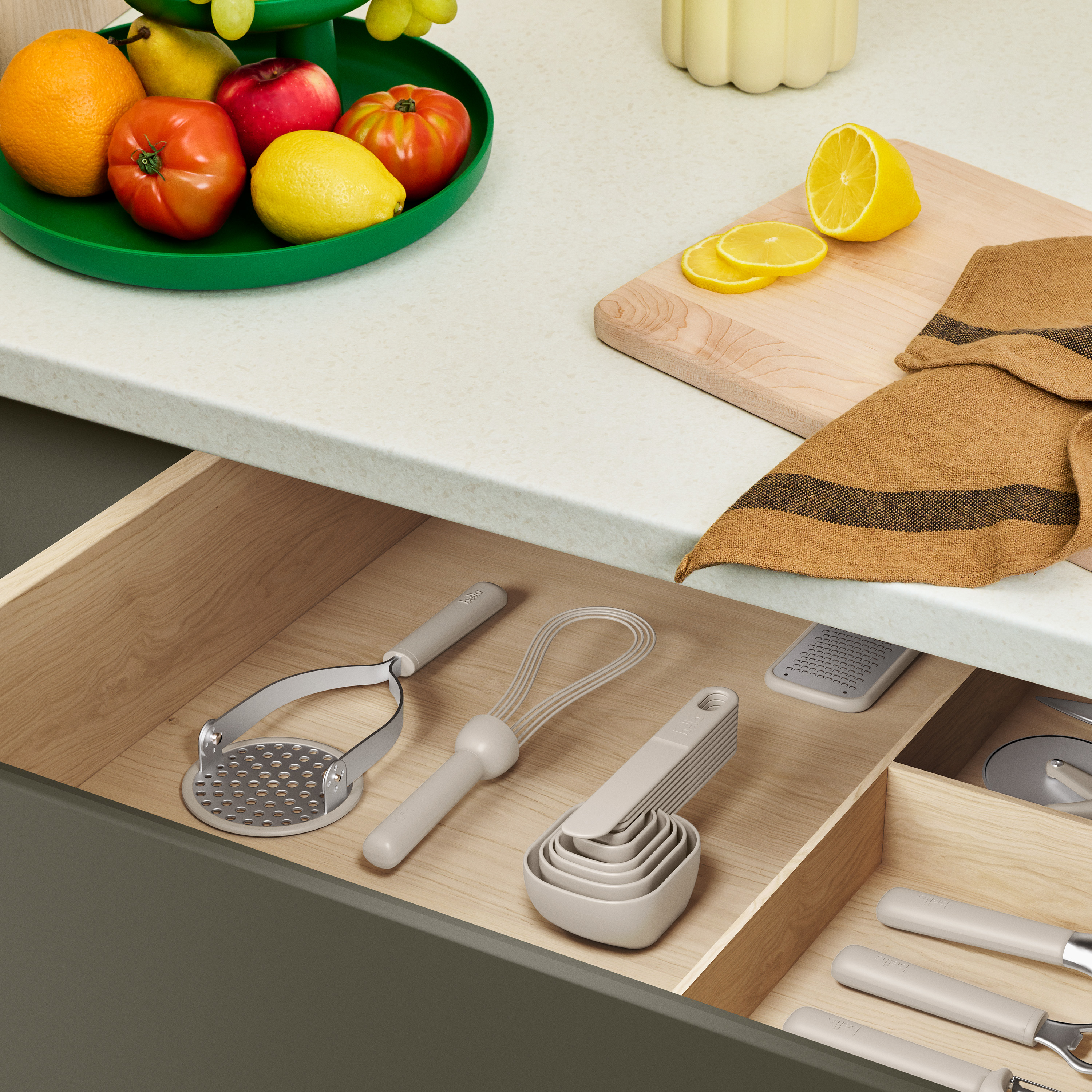 Nesting measuring cups and spoons snap together for compact storage and easy access, keeping drawers organized and clutter-free.