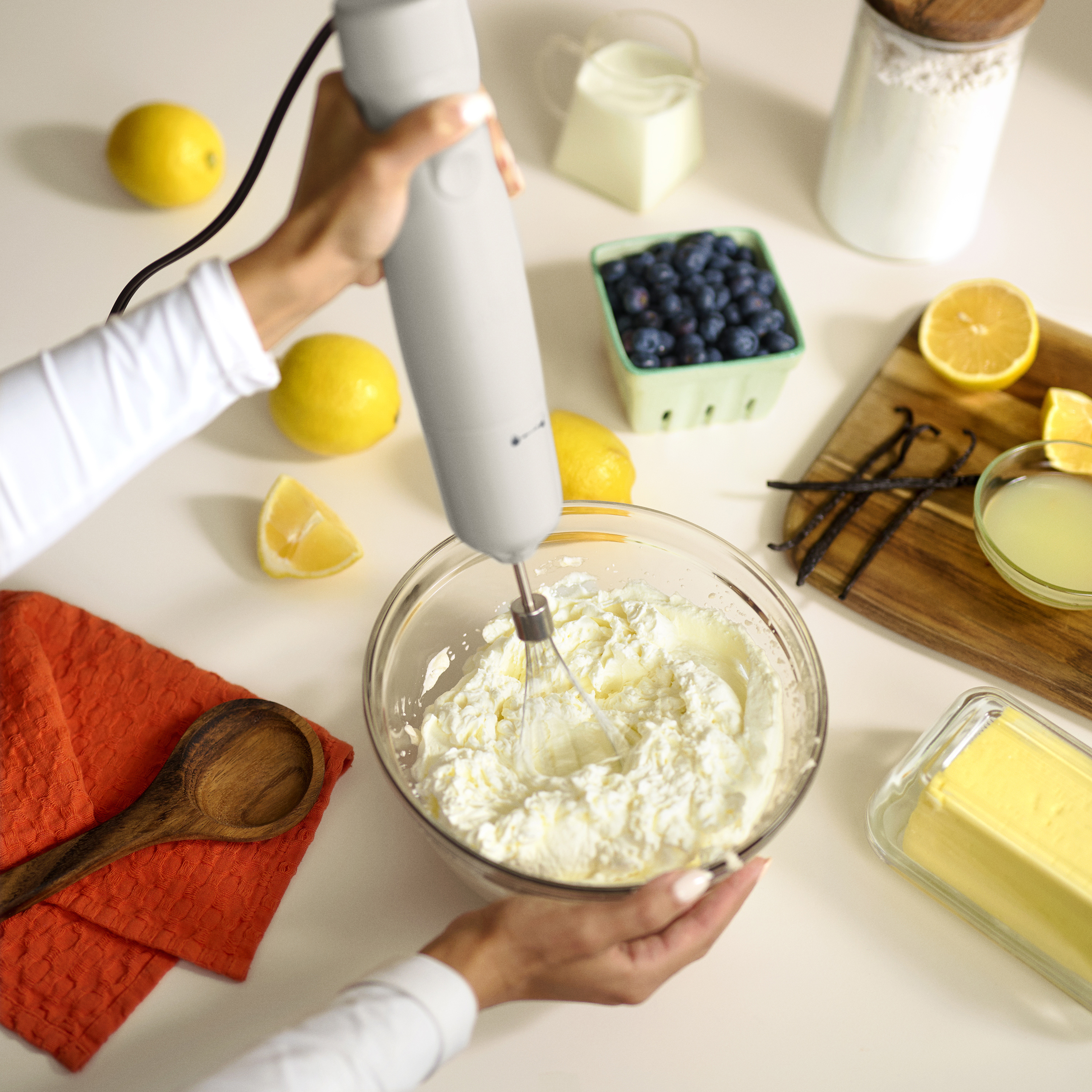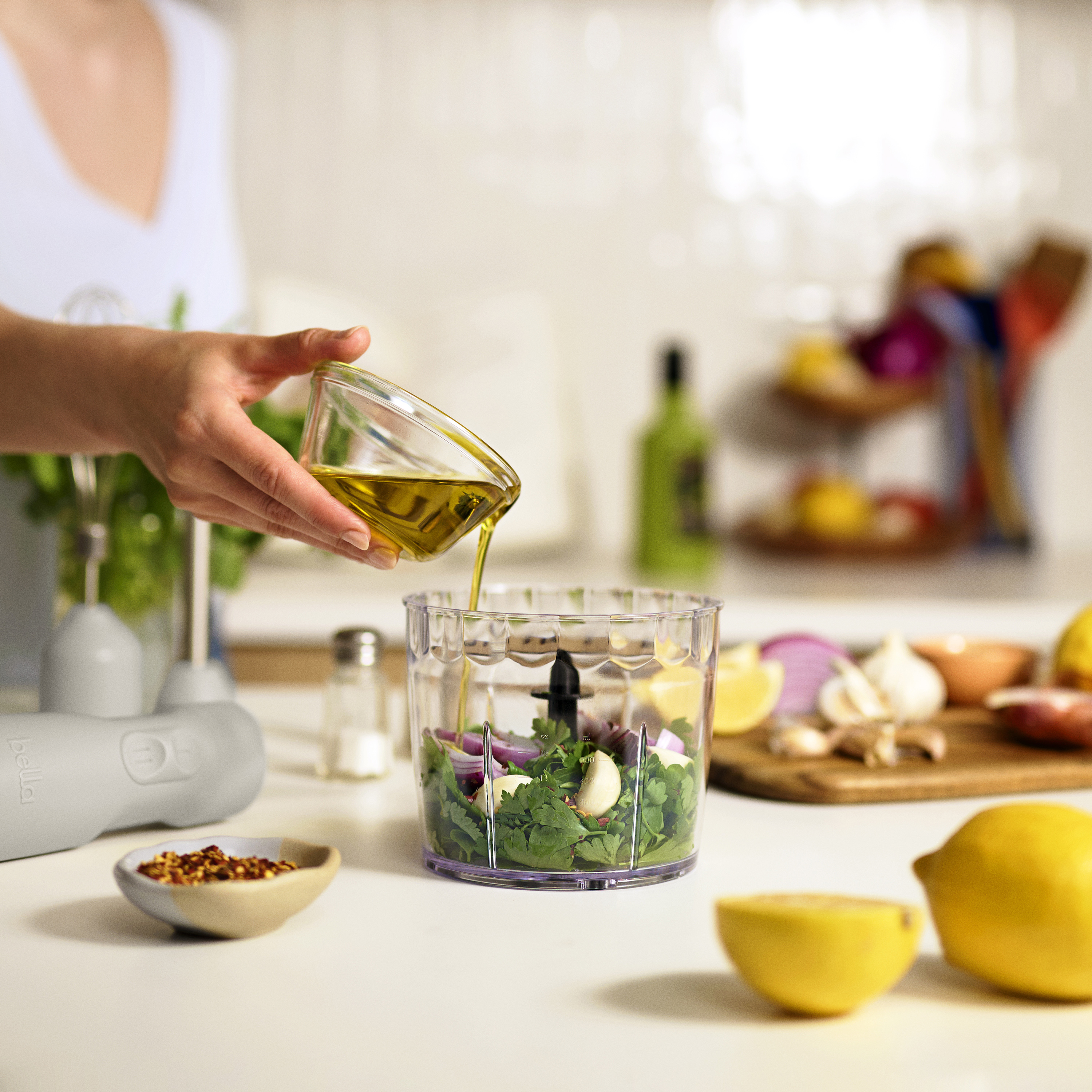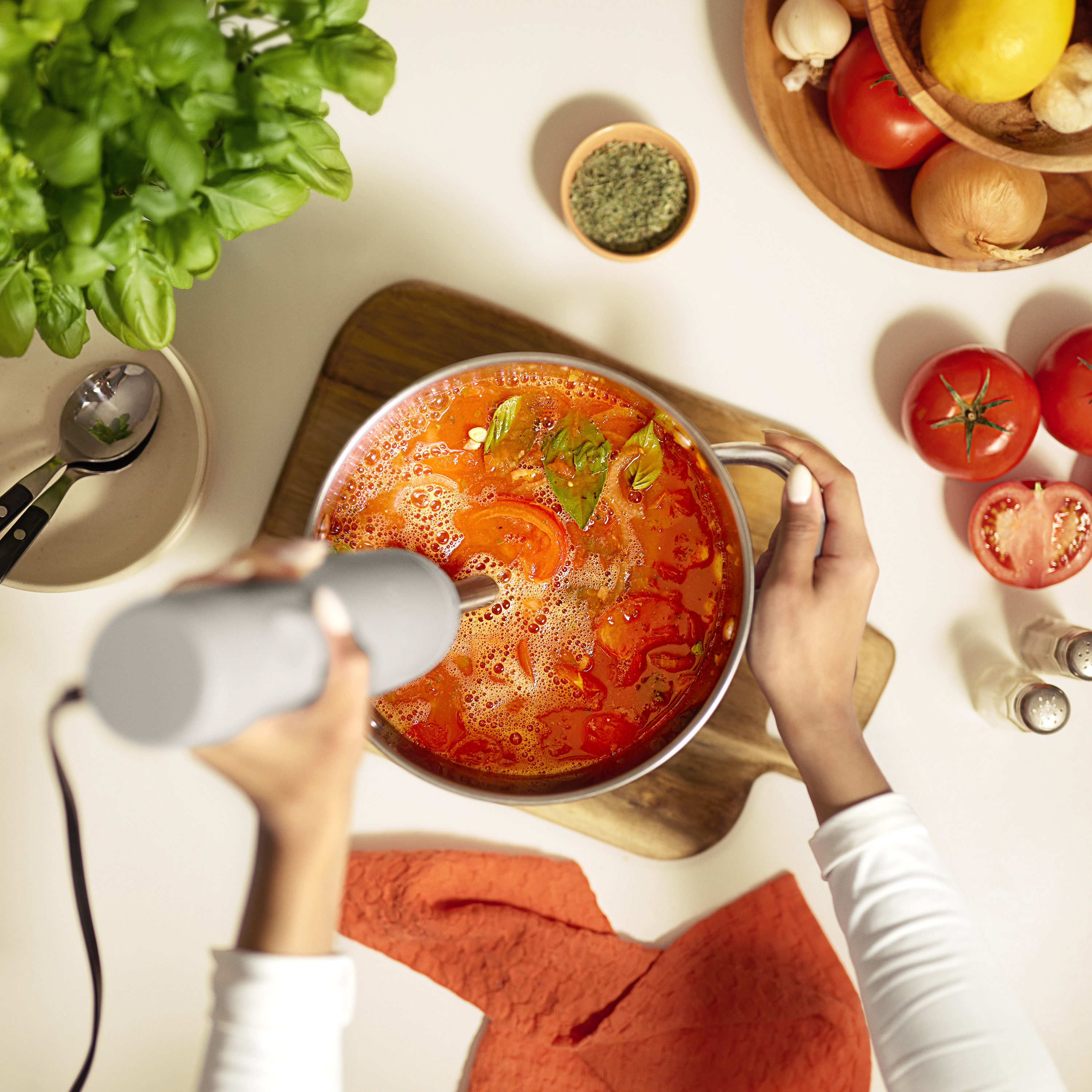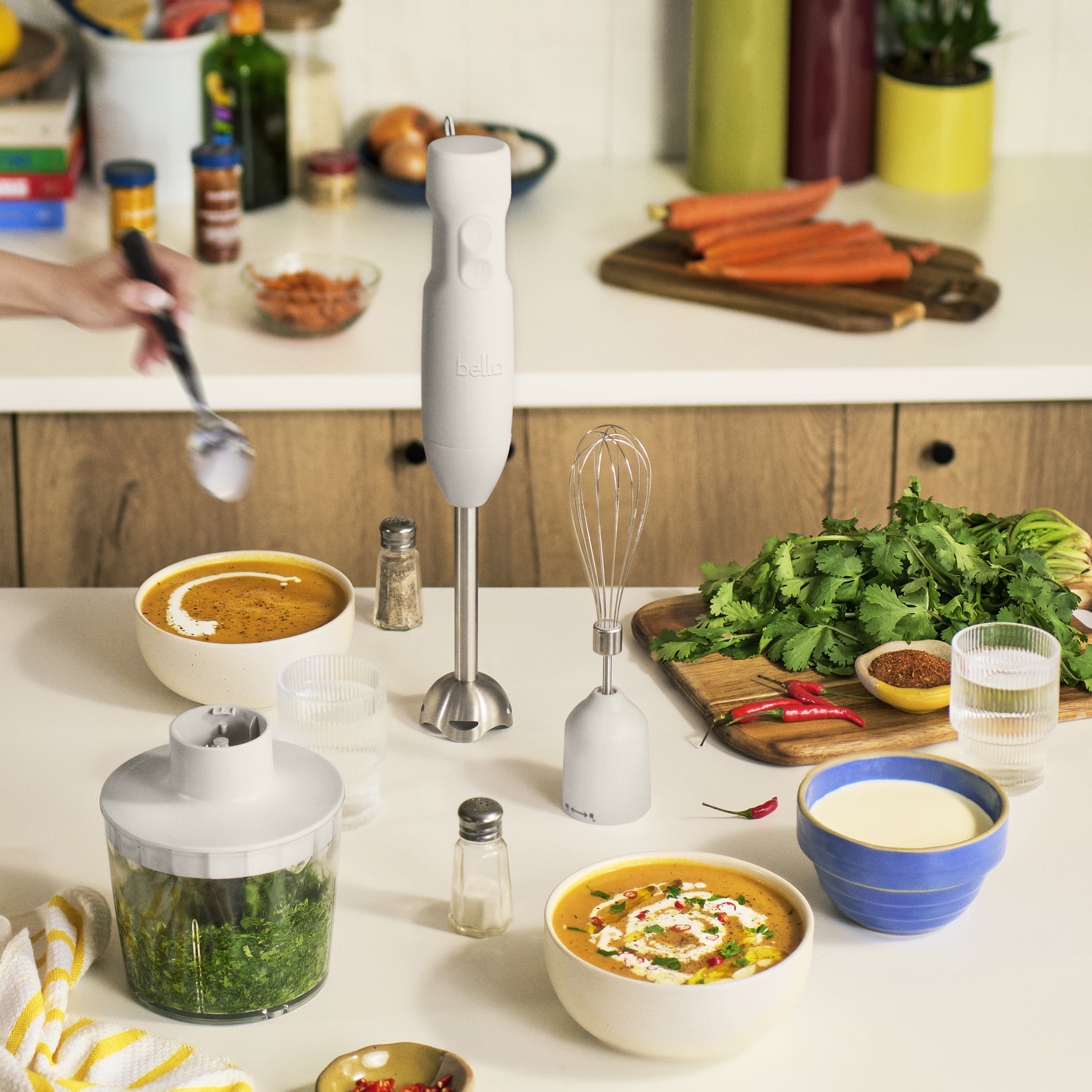 Designed for everyday ease, this sleek, space-smart tool blends, whips, and chops with power and precision. From creamy tomato bisques to chunky salsas to quick chopped herbs for garnish, this multitasker is a must-have for any busy cook. It's simple to use, easy to clean, and stylish enough to store on the counter.